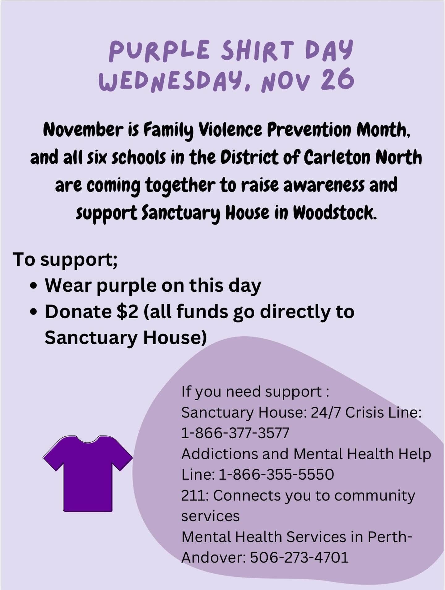 « All Events This event has passed. Purple Shirt Day November 26 @ 8:00 am - 5:00 pm Event Navigation « Veteran’s Dinner RSVP Tree Lighting- Riverside Park » + Google Calendar+ iCal Export Details Date: November 26 Time: 8:00 am - 5:00 pm
